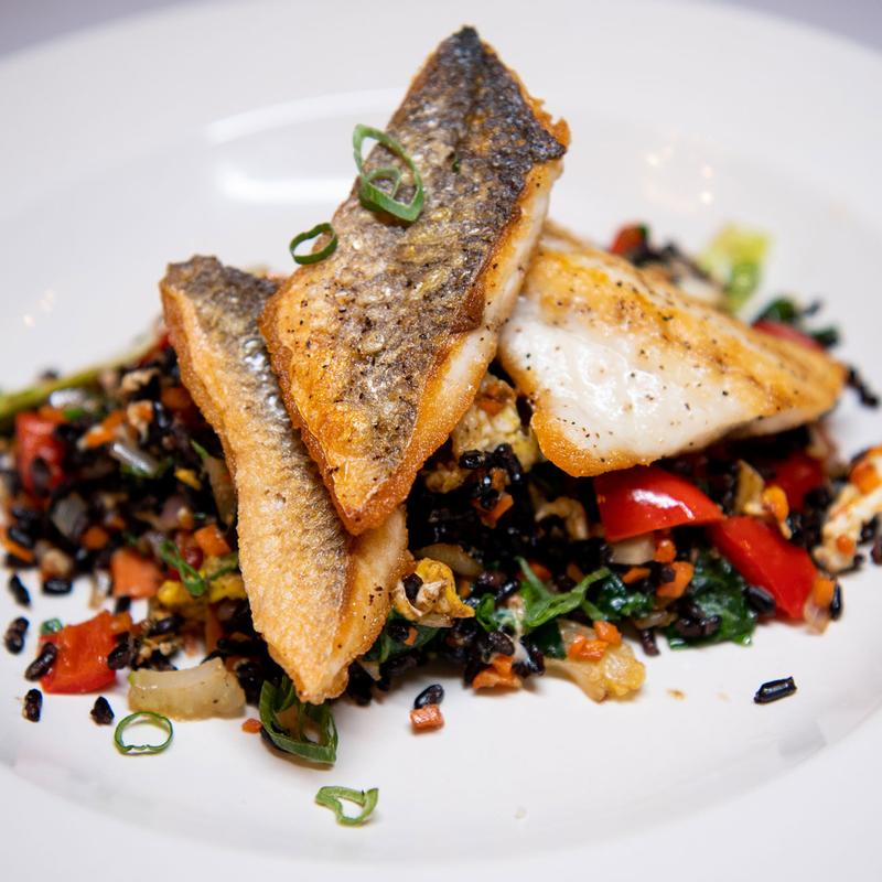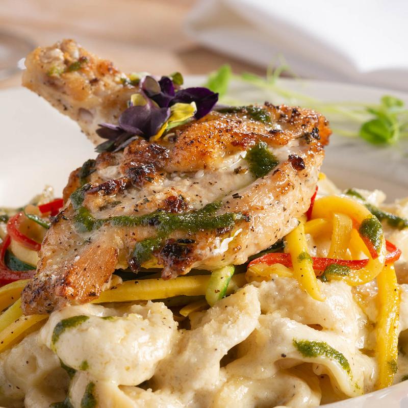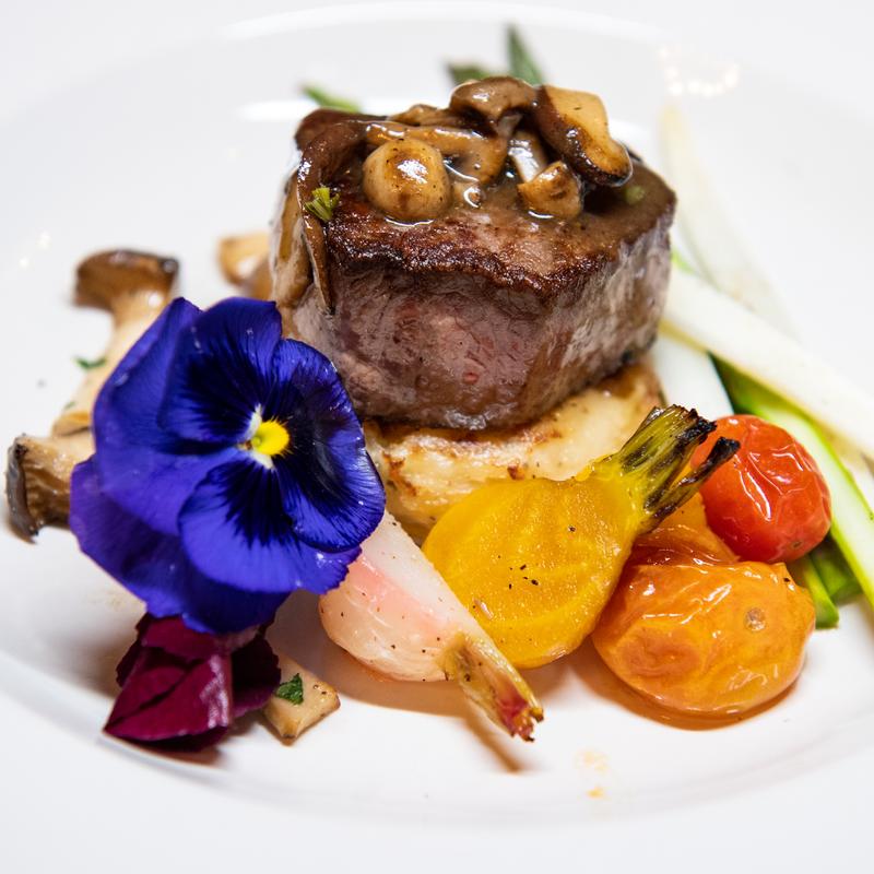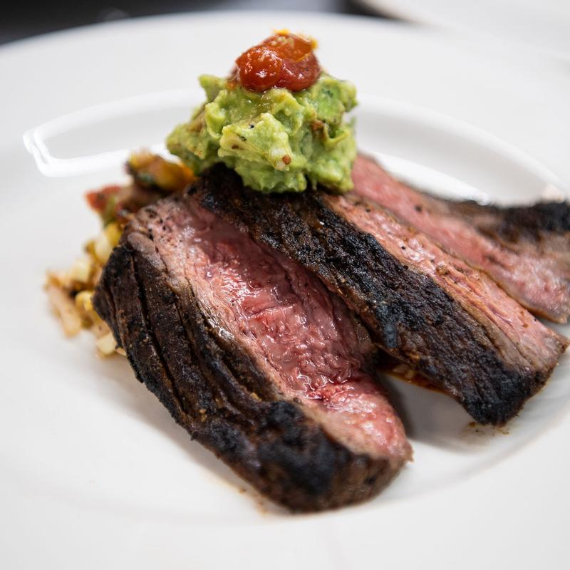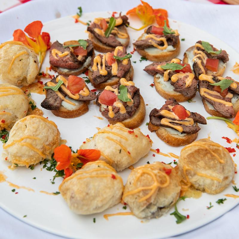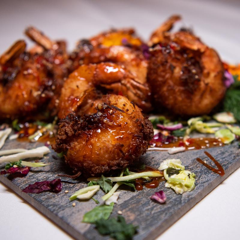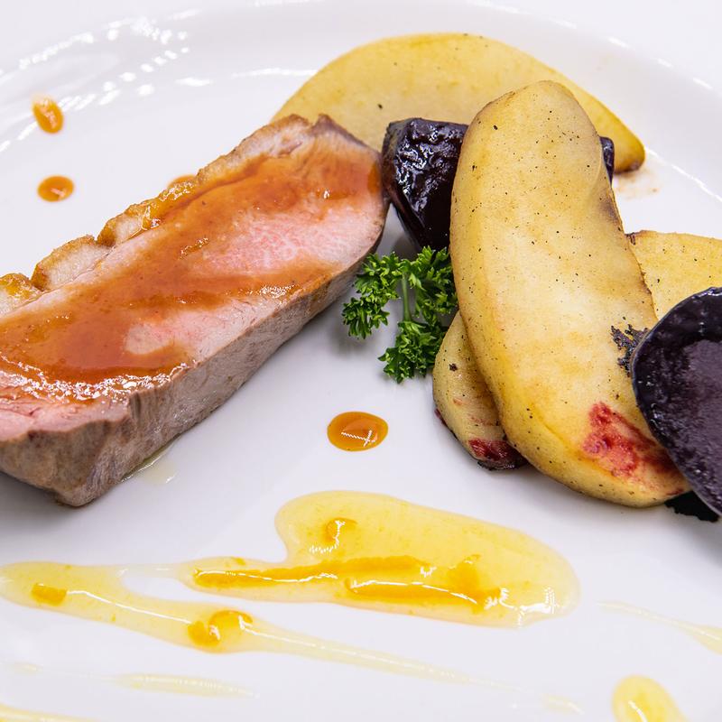 Grilled Banana Bread, Savory Slow-Smoked Pork Belly, Poached Eggs, Sweet Potato Coulis, Spicy Honey