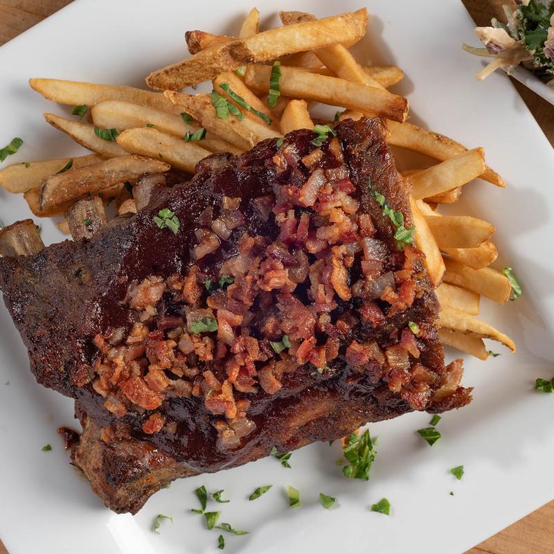 Ground Beef Patties, American Cheese, Pickled Red Onions, Slicked Pickles, Sunny Side Up Egg, Thick-Cut Applewood Bacon, Black Garlic Aioli, Arugula